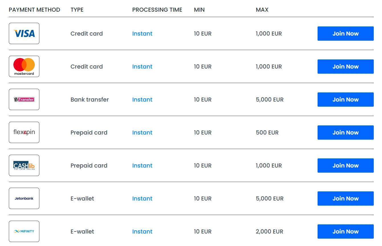 Financiële flexibiliteit kenmerkt de betalingsstructuur van dit online platform. Spelers beschikken over acht verschillende transactiemethoden, waaronder zowel traditionele als moderne oplossingen. Mijn analyse van het betalingssysteem toont een evenwichtige mix tussen veiligheid en gebruiksgemak.