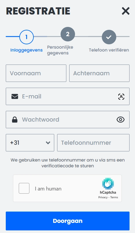 Klik op “Register” en vul de vereiste velden in: naam, e-mail, telefoon, wachtwoord, adres, geboortedatum en geslacht. Voltooi de KYC-verificatie door een geldig identiteitsbewijs en adresbewijs te uploaden. Na bevestiging logt u met e-mail en wachtwoord in.